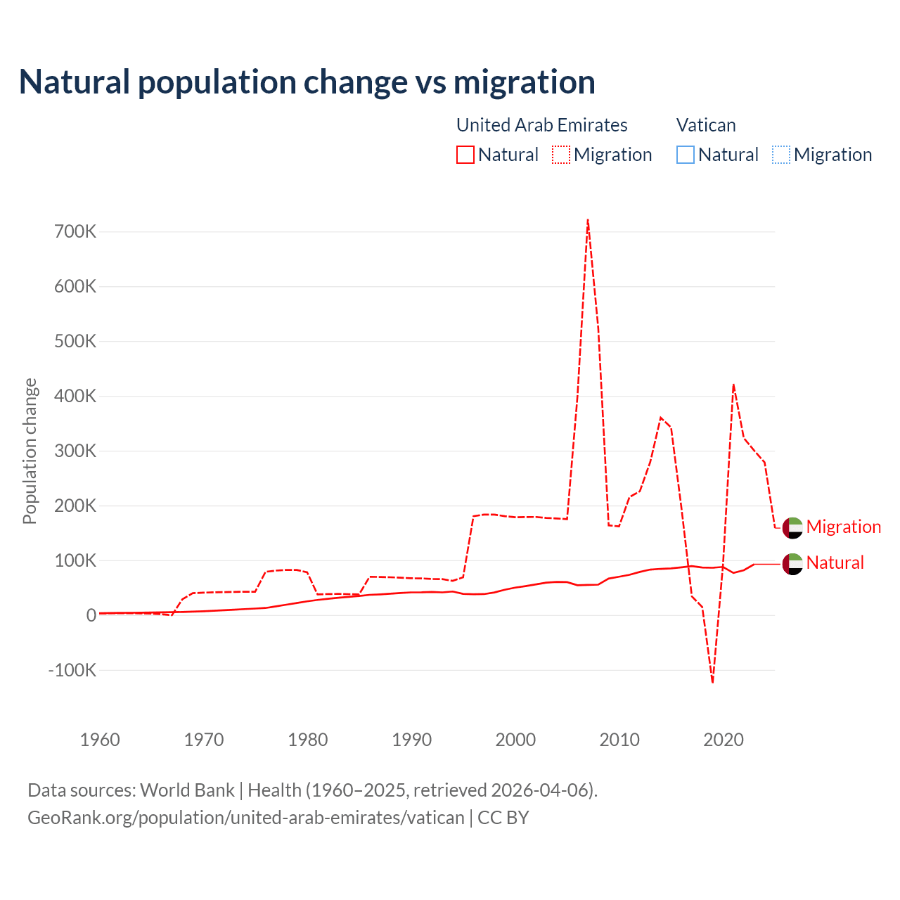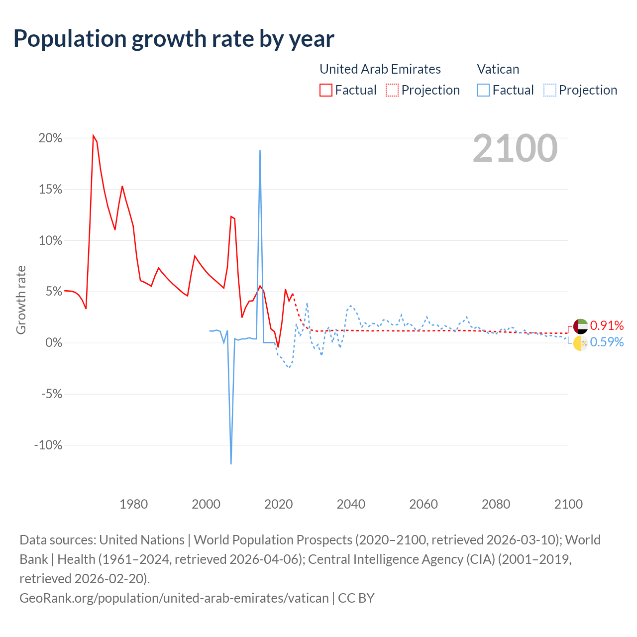- For the last 10 years, the United Arab Emirates has had an average growth rate of +3.31% per year vs +1.9% in the Vatican.