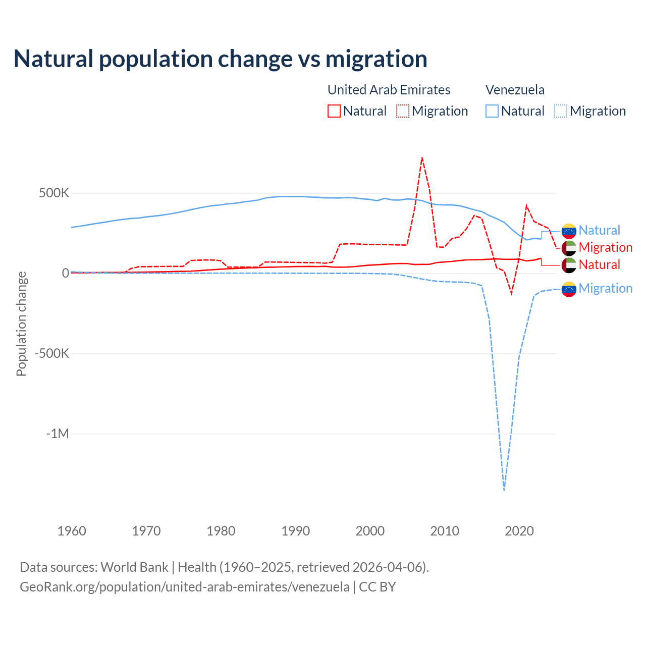 Over the last 10 years, 30.5% of the population change in the United Arab Emirates is from natural causes (a gain of 857,996 people) and 69.5% is from migration (a gain of 1,958,520 people). In Venezuela 38.6% is from natural causes (a gain of 2,946,257 people) and 61.4% is from migration (a loss of 4,683,227 people).