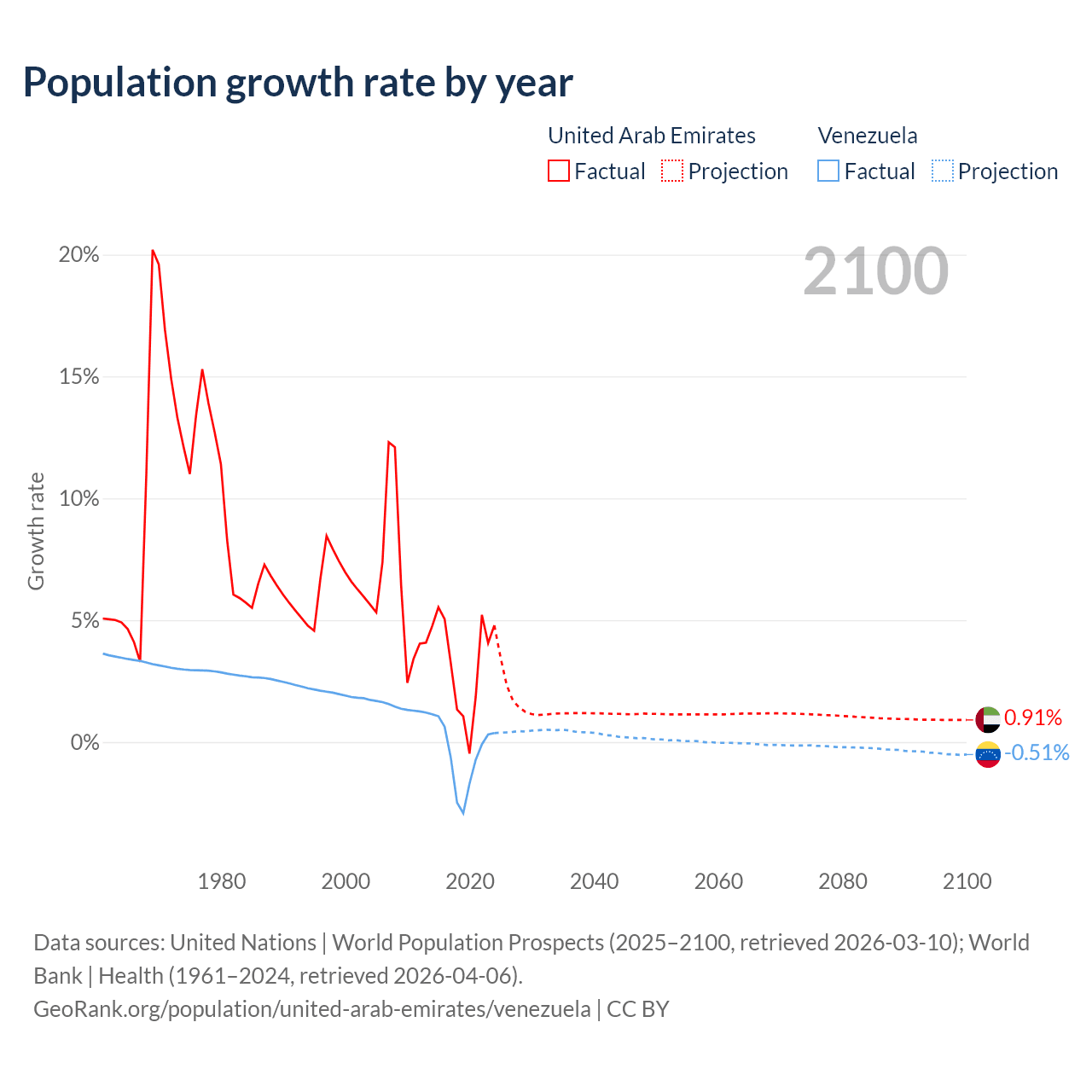 - For the last 10 years, the United Arab Emirates has had an average growth rate of +3.31% per year vs -0.46% in Venezuela.