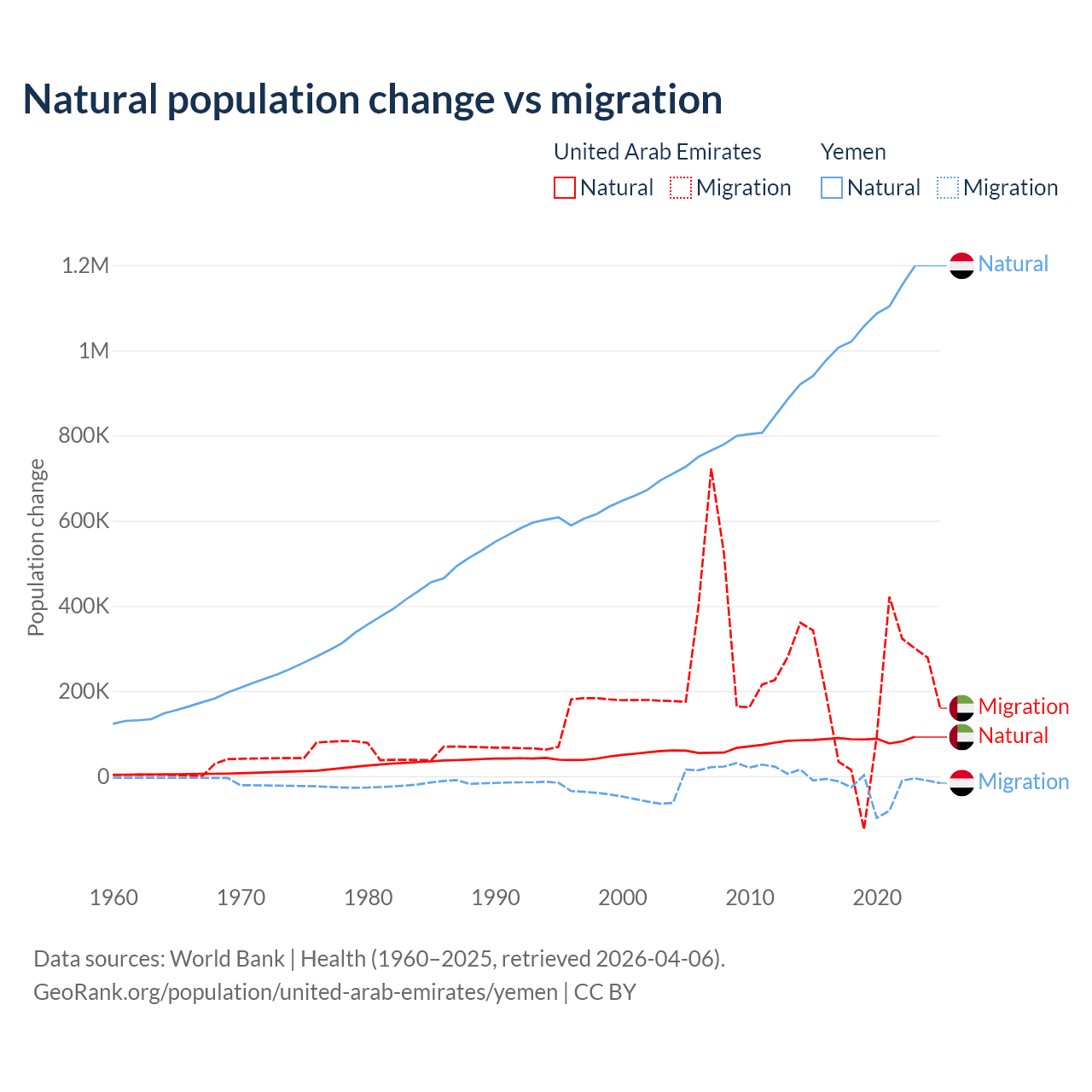 Over the last 10 years, 30.5% of the population change in the United Arab Emirates is from natural causes (a gain of 857,996 people) and 69.5% is from migration (a gain of 1,958,520 people). In Yemen 97.8% is from natural causes (a gain of 10,460,813 people) and 2.17% is from migration (a loss of 231,814 people).