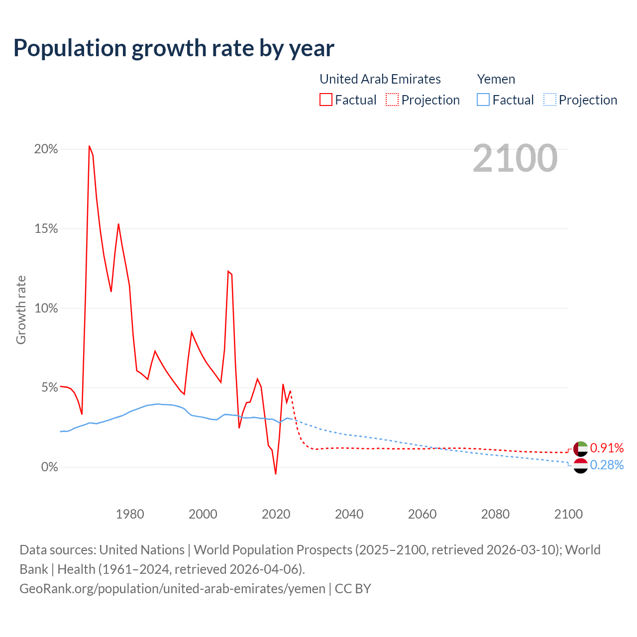 - For the last 10 years, the United Arab Emirates has had an average growth rate of +3.31% per year vs +3% in Yemen.
