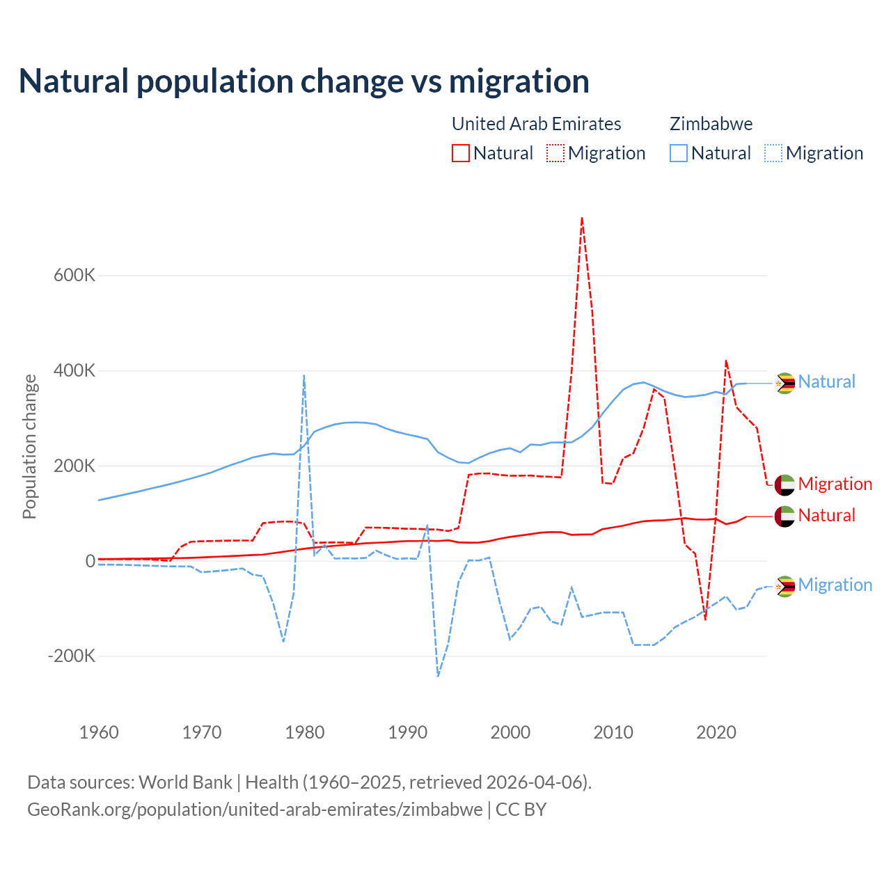 Over the last 10 years, 30.5% of the population change in the United Arab Emirates is from natural causes (a gain of 857,996 people) and 69.5% is from migration (a gain of 1,958,520 people). In Zimbabwe 74.9% is from natural causes (a gain of 3,558,487 people) and 25.1% is from migration (a loss of 1,192,807 people).