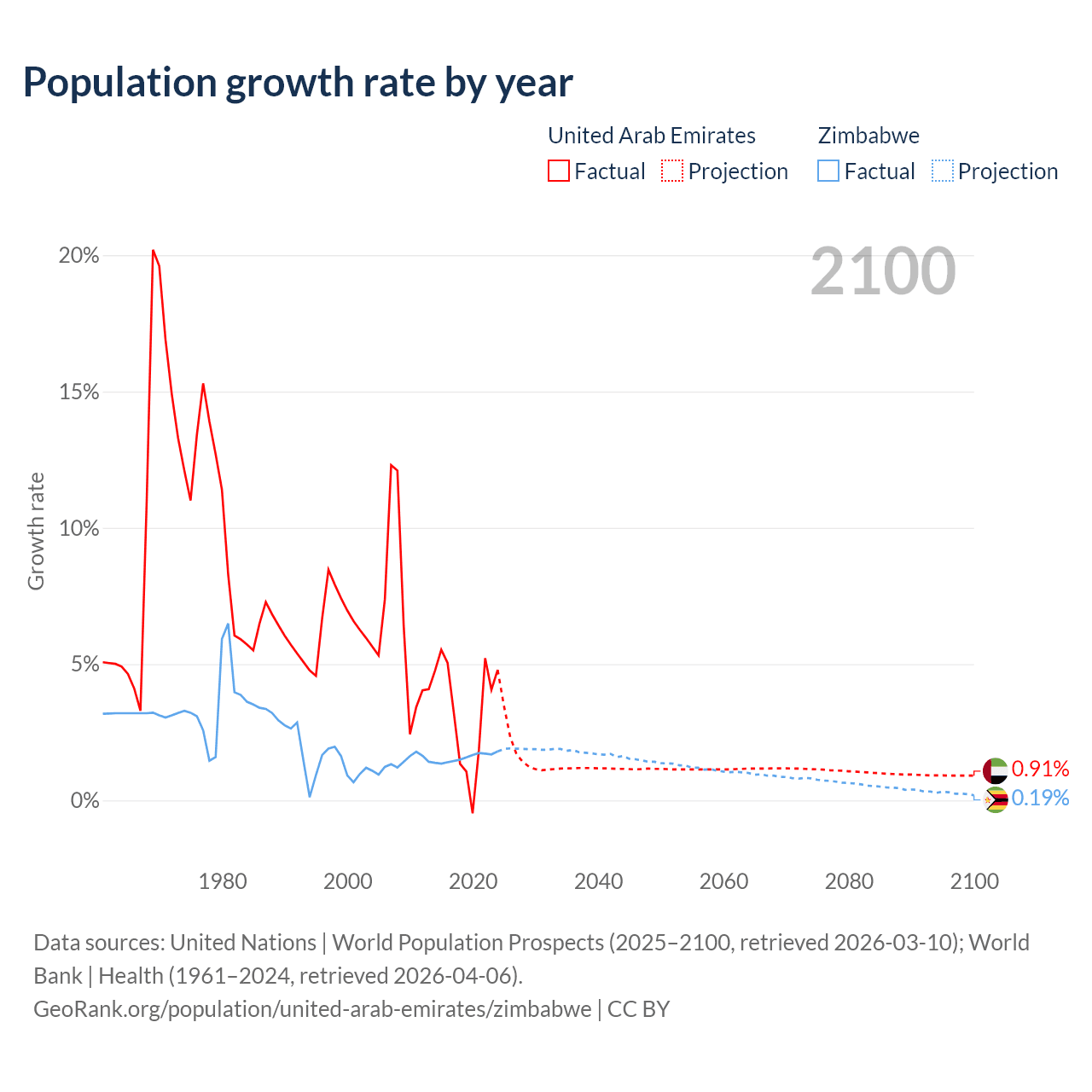 - For the last 10 years, the United Arab Emirates has had an average growth rate of +3.31% per year vs +1.57% in Zimbabwe.
