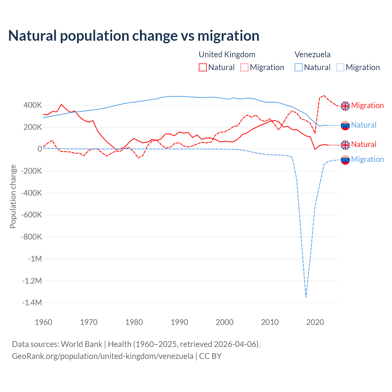Over the last 10 years, 23.9% of the population change in the United Kingdom is from natural causes (a gain of 1,033,129 people) and 76.1% is from migration (a gain of 3,283,101 people). In Venezuela 38.6% is from natural causes (a gain of 2,946,257 people) and 61.4% is from migration (a loss of 4,683,227 people).