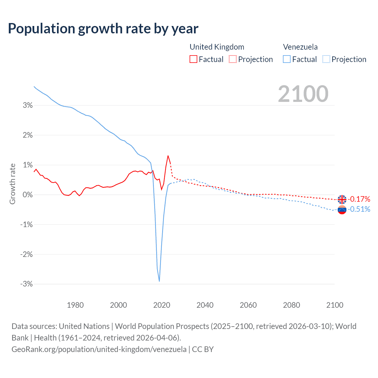 - For the last 10 years, the United Kingdom has had an average growth rate of +0.7% per year vs -0.46% in Venezuela.