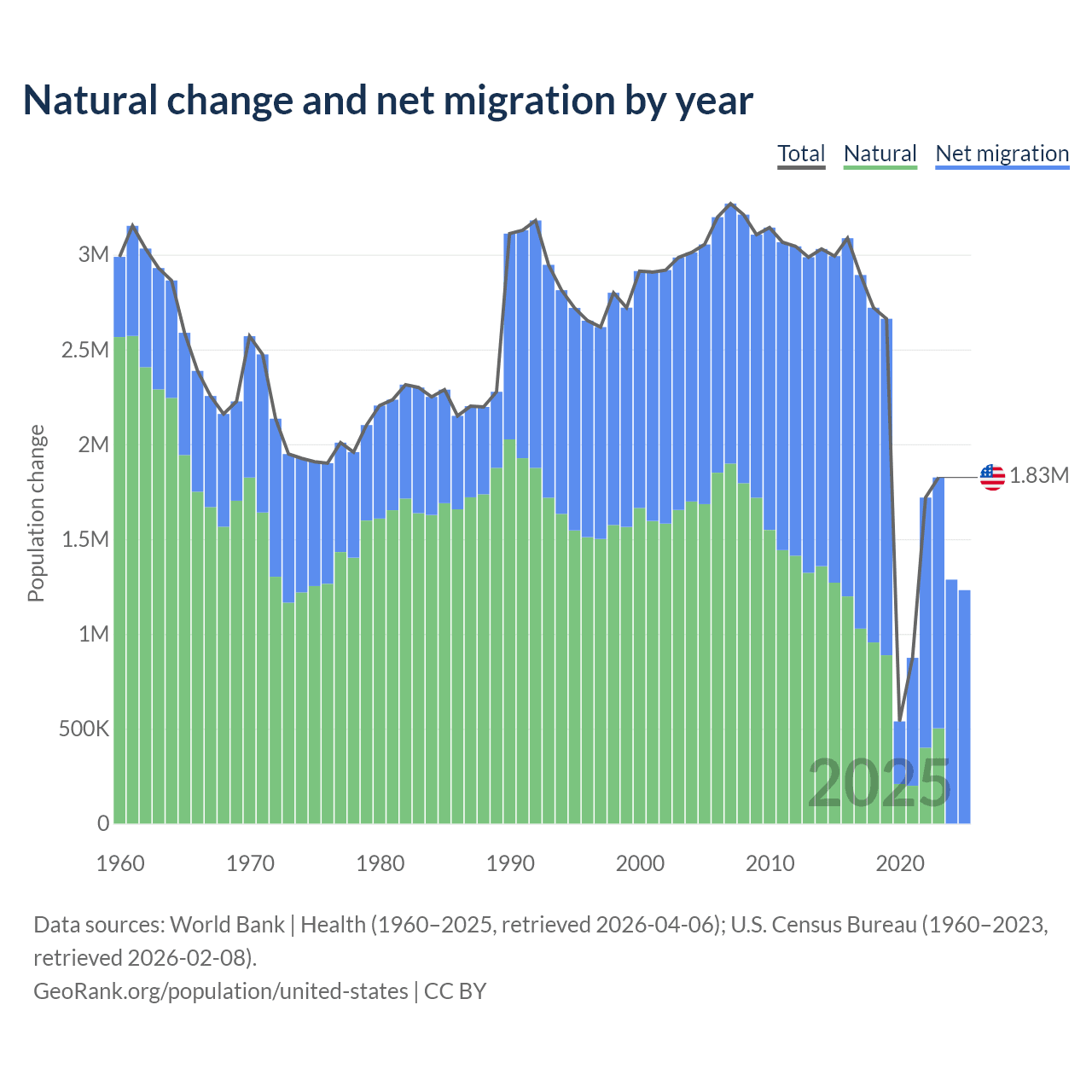 Data sources: World Bank | Health (1960–2025, retrieved 2026-04-06); U.S. Census Bureau (1960–2023, retrieved 2026-02-08).