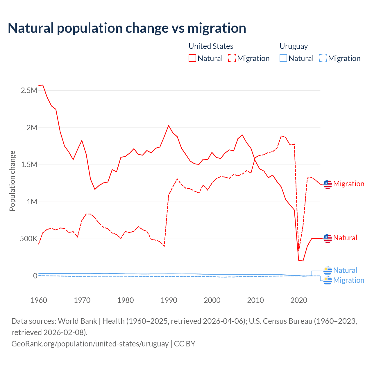 Over the last 10 years, 35.8% of the population change in the United States is from natural causes (a gain of 8,005,866 people) and 64.2% is from migration (a gain of 14,334,286 people). In Uruguay 70% is from natural causes (a gain of 64,303 people) and 30% is from migration (a loss of 27,501 people).