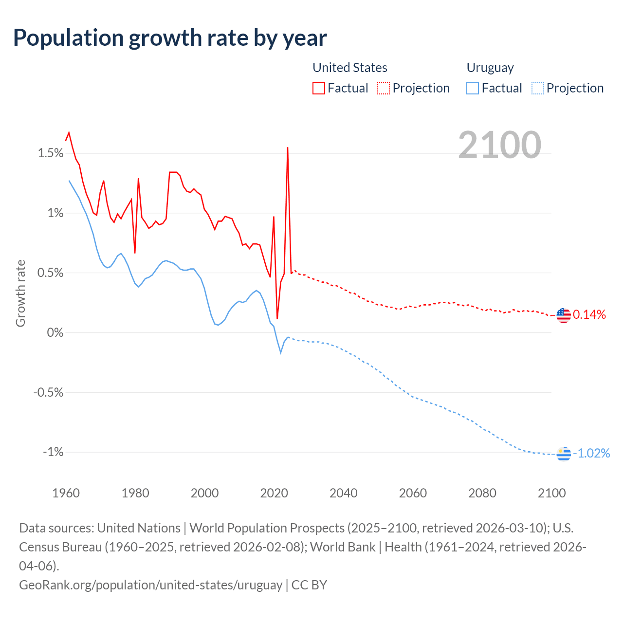 - For the last 10 years, the United States has had an average growth rate of +0.65% per year vs +0.11% in Uruguay.