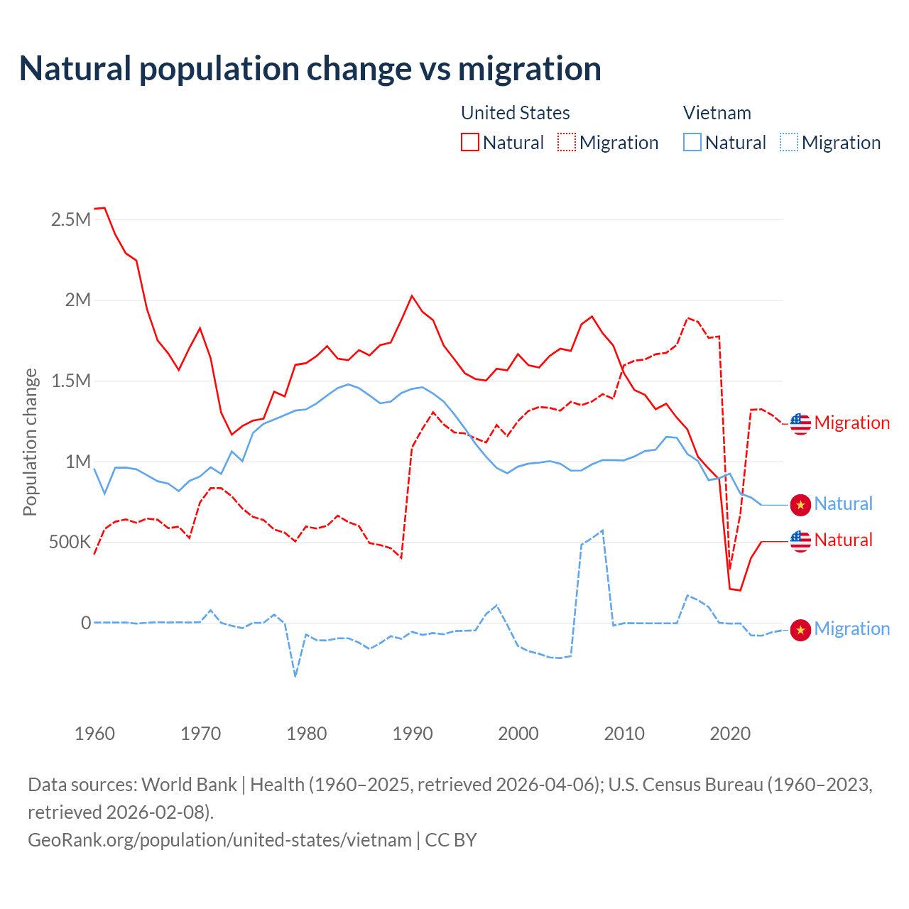 Data sources: World Bank | Health (1960–2025, retrieved 2026-04-06); U.S. Census Bureau (1960–2023, retrieved 2026-02-08).