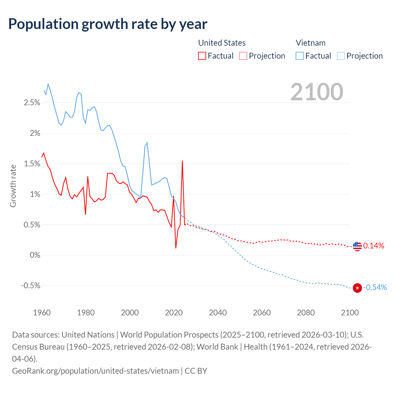 Data sources: World Bank | Health (1960–2024, retrieved 2026-04-06); United Nations | World Population Prospects (1960–2026, retrieved 2026-03-10); U.S. Census Bureau (1960–2025, retrieved 2026-02-08); Central Intelligence Agency (CIA) (2000–2019, retrieved 2026-02-20).