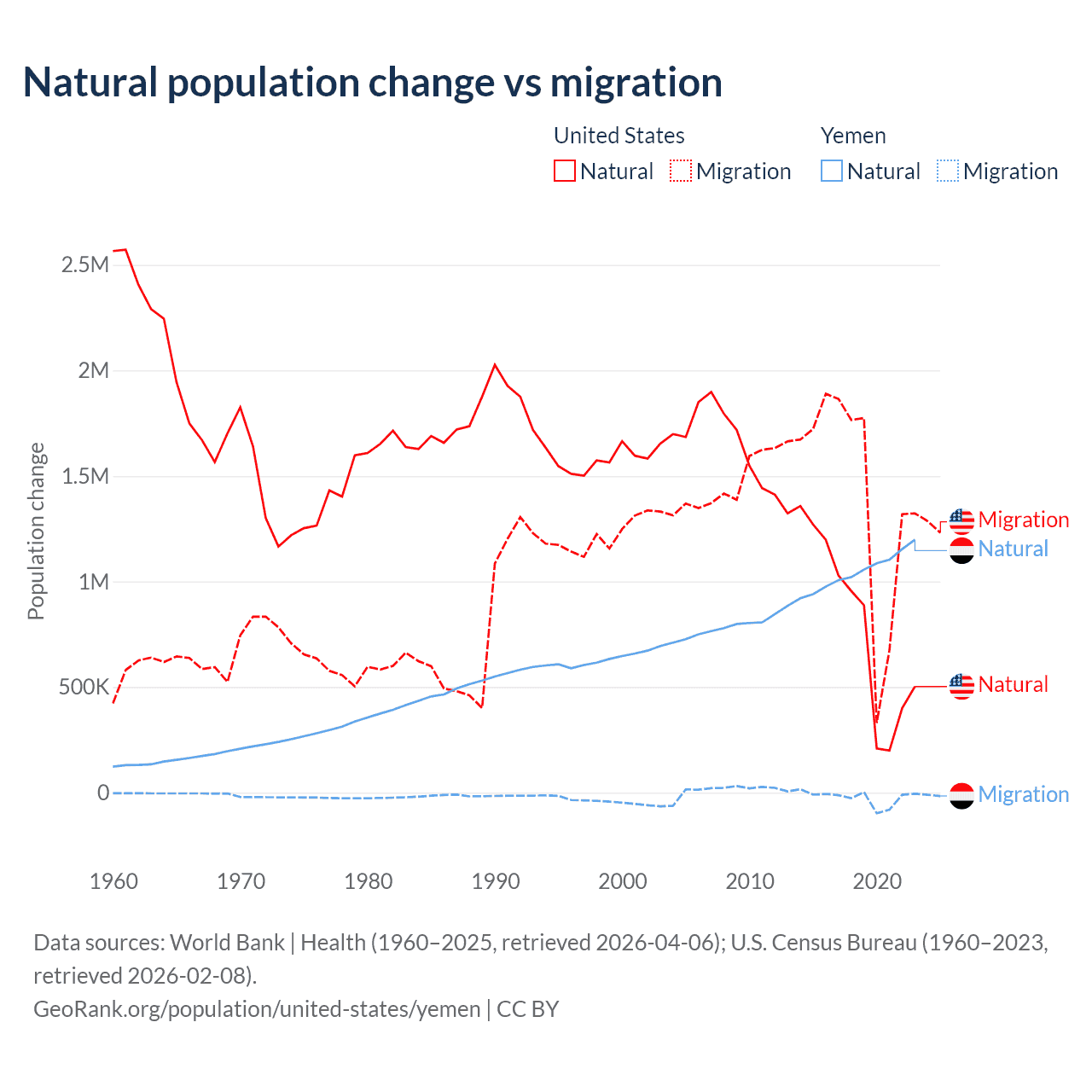 Data sources: World Bank | Health (1960–2025, retrieved 2026-04-06); U.S. Census Bureau (1960–2023, retrieved 2026-02-08).