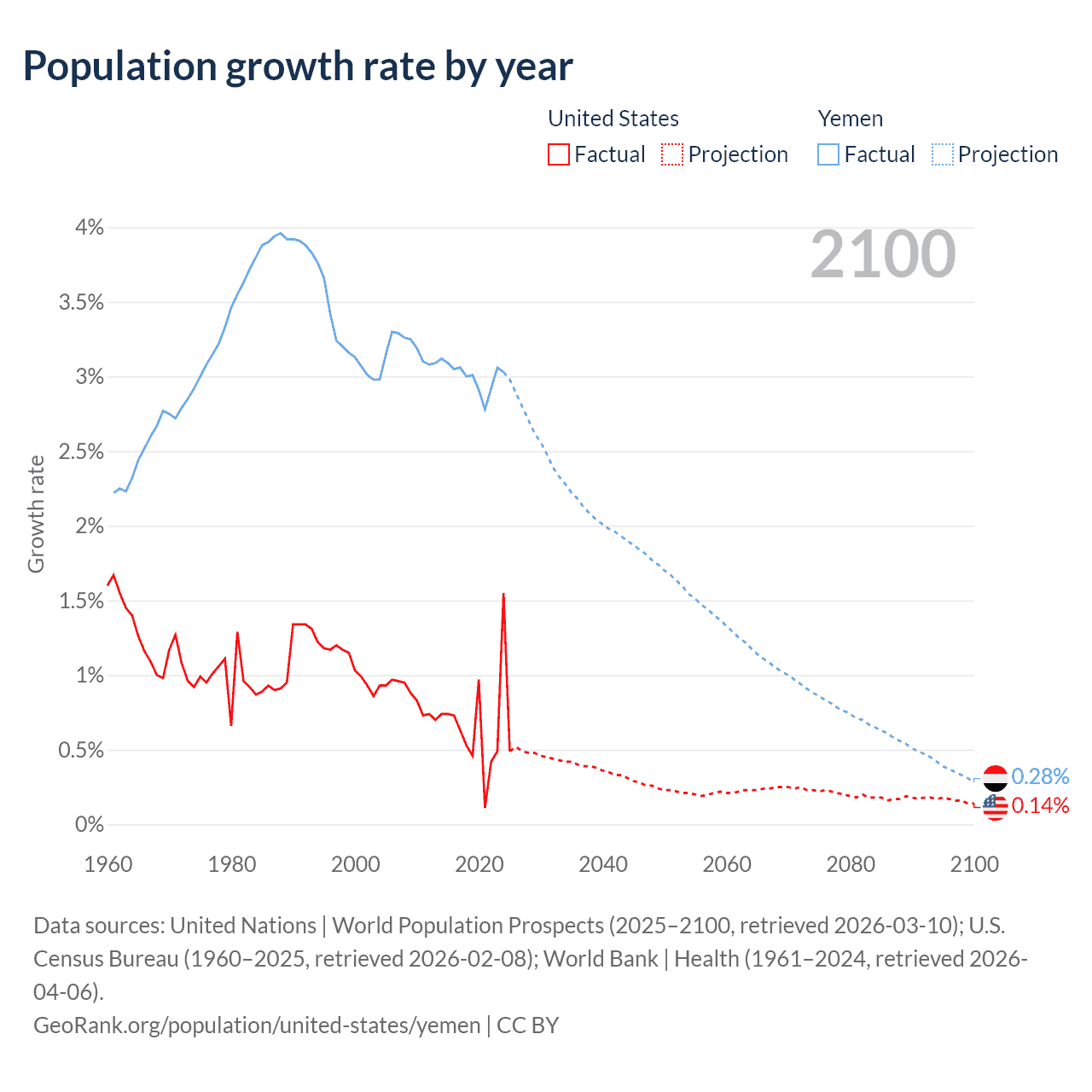 Data sources: World Bank | Health (1960–2024, retrieved 2026-04-06); United Nations | World Population Prospects (1960–2026, retrieved 2026-03-10); U.S. Census Bureau (1960–2025, retrieved 2026-02-08); Central Intelligence Agency (CIA) (2000–2019, retrieved 2026-02-20).
