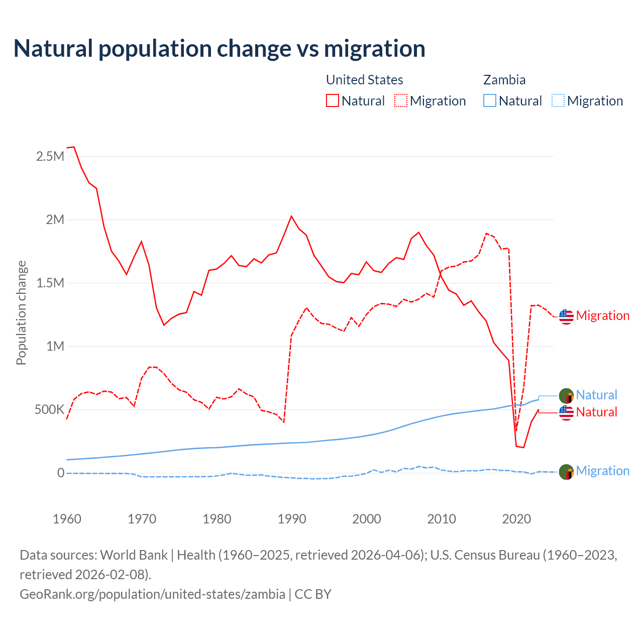Over the last 10 years, 35.8% of the population change in the United States is from natural causes (a gain of 8,005,866 people) and 64.2% is from migration (a gain of 14,334,286 people). In Zambia 97.4% is from natural causes (a gain of 5,233,797 people) and 2.58% is from migration (a gain of 138,554 people).