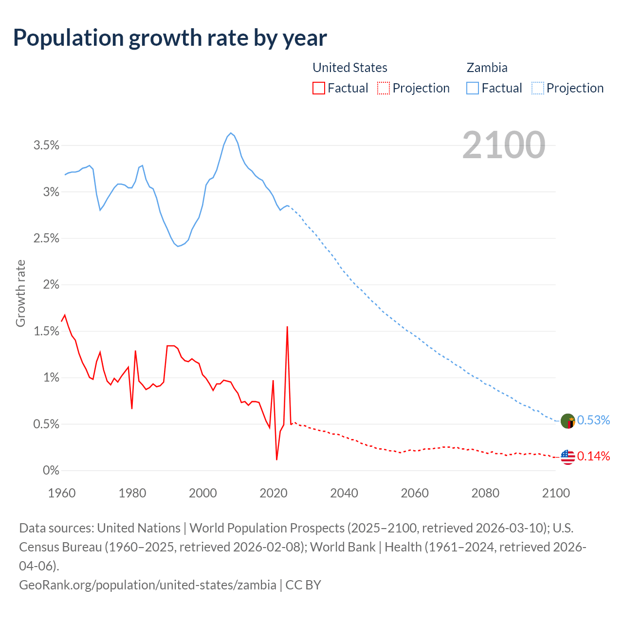 - For the last 10 years, the United States has had an average growth rate of +0.65% per year vs +3% in Zambia.