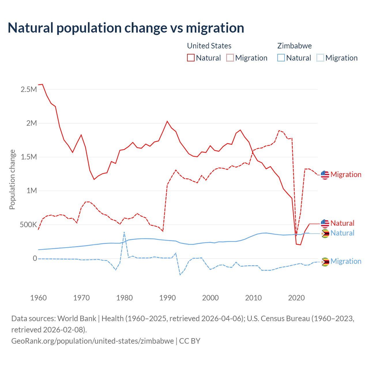 Over the last 10 years, 35.8% of the population change in the United States is from natural causes (a gain of 8,005,866 people) and 64.2% is from migration (a gain of 14,334,286 people). In Zimbabwe 74.9% is from natural causes (a gain of 3,558,487 people) and 25.1% is from migration (a loss of 1,192,807 people).