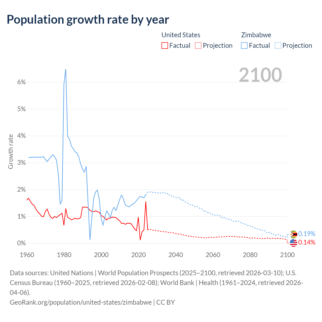 - For the last 10 years, the United States has had an average growth rate of +0.65% per year vs +1.57% in Zimbabwe.