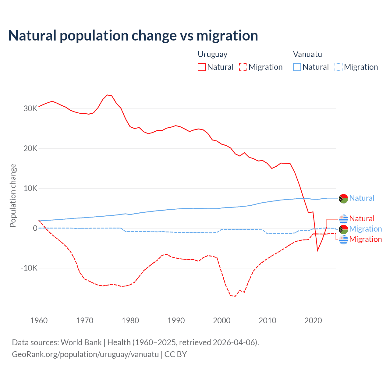 Over the last 10 years, 70% of the population change in Uruguay is from natural causes (a gain of 64,303 people) and 30% is from migration (a loss of 27,501 people). In Vanuatu 92.2% is from natural causes (a gain of 72,941 people) and 7.81% is from migration (a loss of 6,181 people).