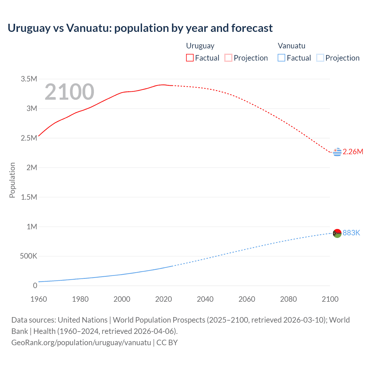 Uruguay vs Vanuatu: population by year and forecast