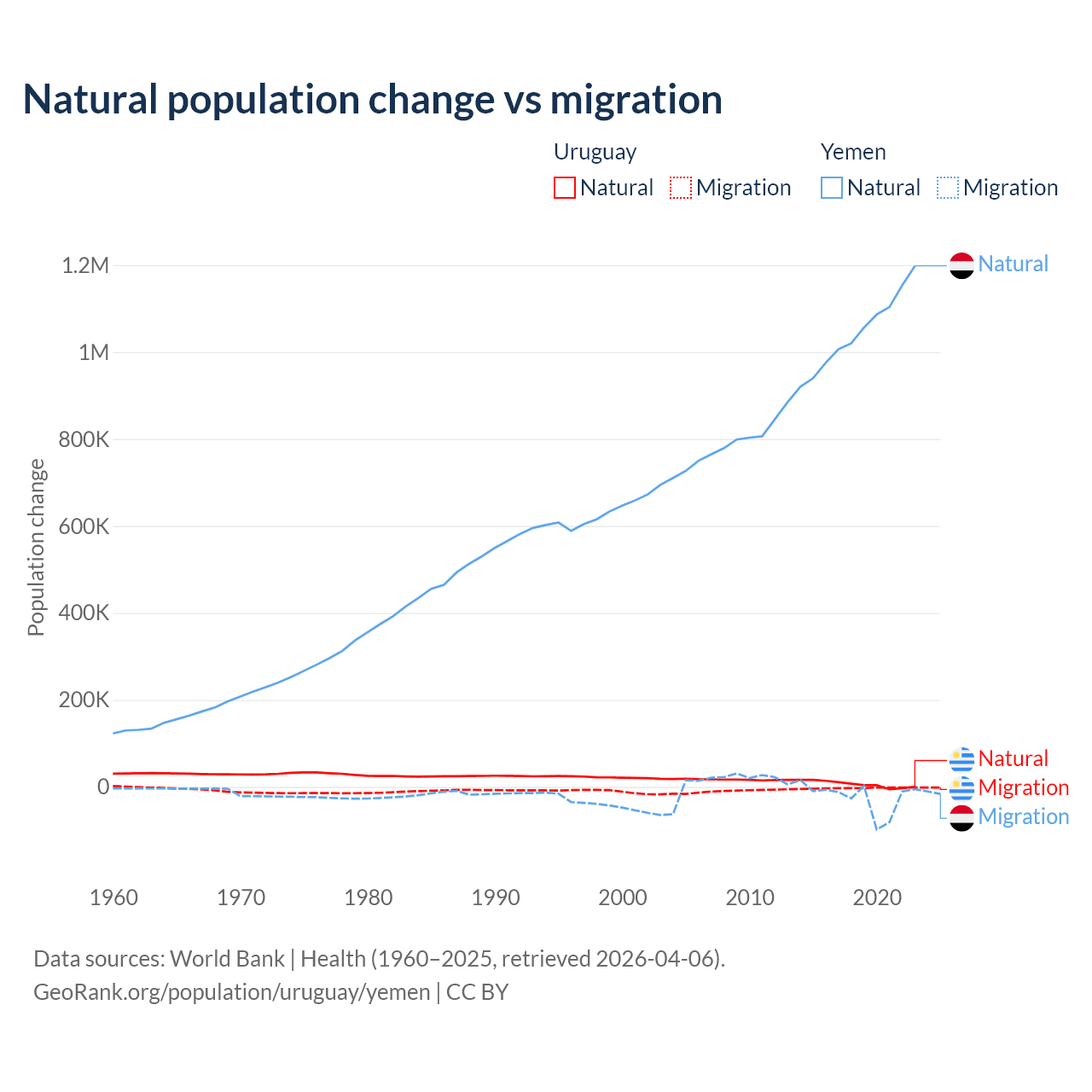 Over the last 10 years, 70% of the population change in Uruguay is from natural causes (a gain of 64,303 people) and 30% is from migration (a loss of 27,501 people). In Yemen 97.8% is from natural causes (a gain of 10,460,813 people) and 2.17% is from migration (a loss of 231,814 people).