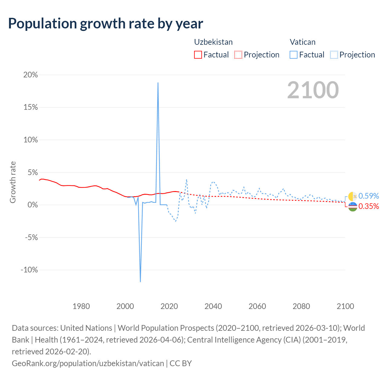 - For the last 10 years, Uzbekistan has had an average growth rate of +1.85% per year vs +1.9% in the Vatican.