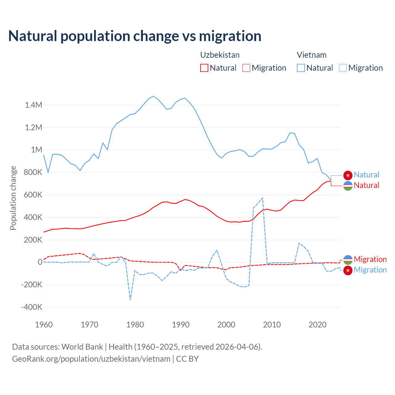 Over the last 10 years, 98.2% of the population change in Uzbekistan is from natural causes (a gain of 6,161,117 people) and 1.84% is from migration (a loss of 115,398 people). In Vietnam 97.7% is from natural causes (a gain of 9,349,756 people) and 2.29% is from migration (a gain of 219,073 people).