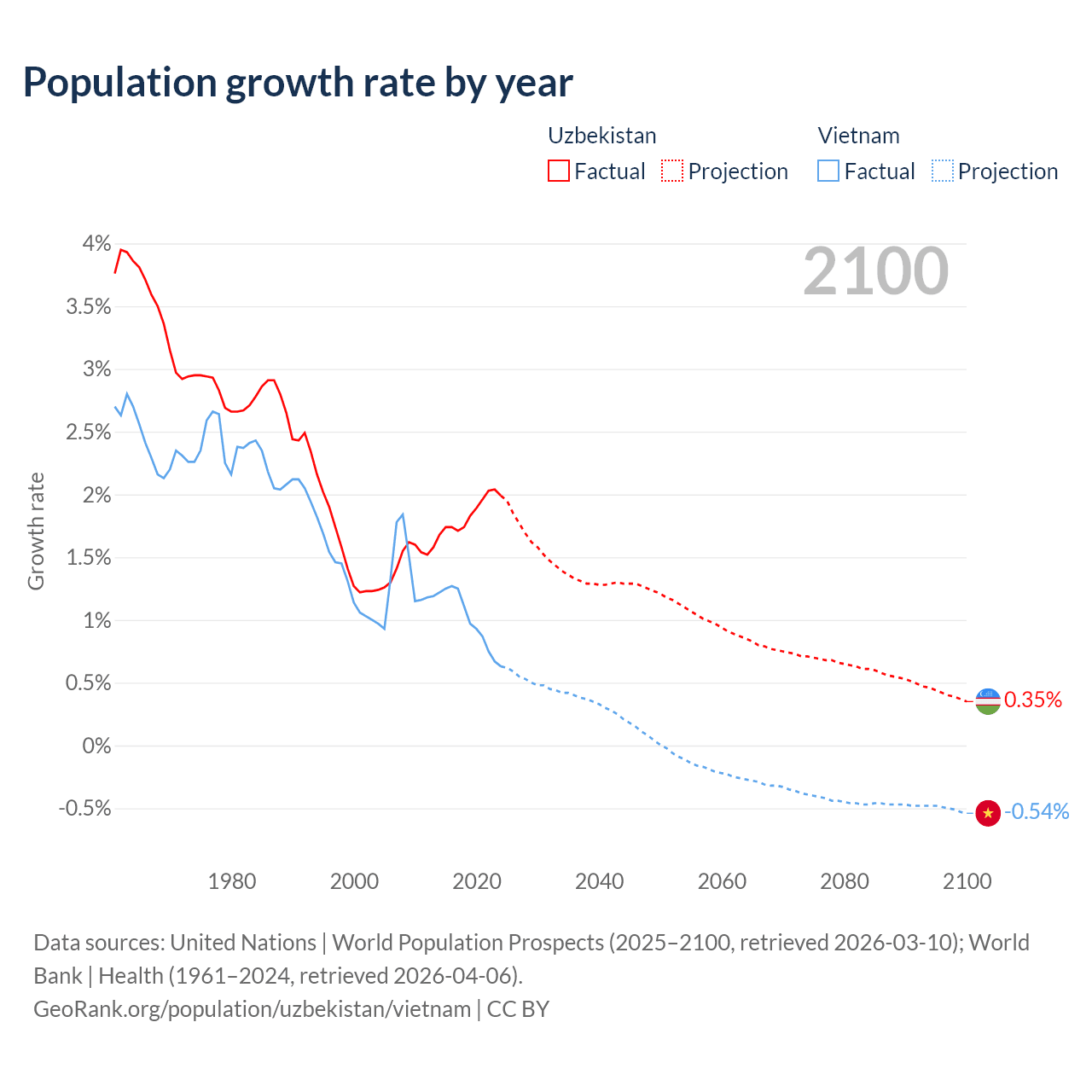 - For the last 10 years, Uzbekistan has had an average growth rate of +1.85% per year vs +0.99% in Vietnam.