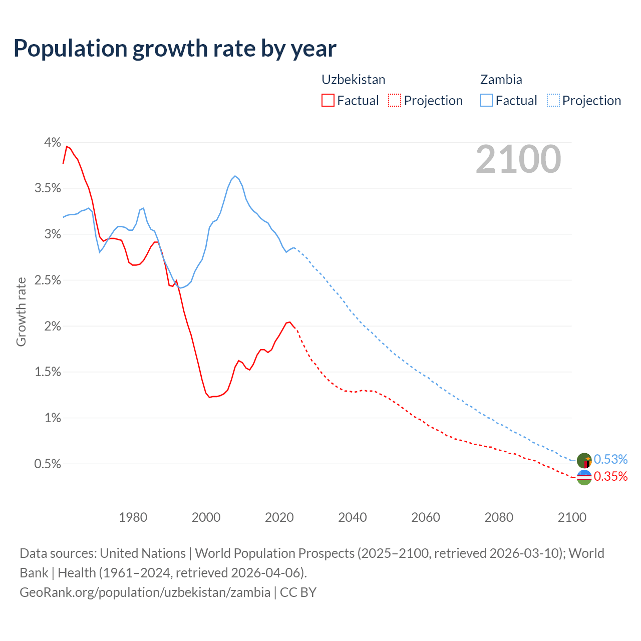 - For the last 10 years, Uzbekistan has had an average growth rate of +1.85% per year vs +3% in Zambia.