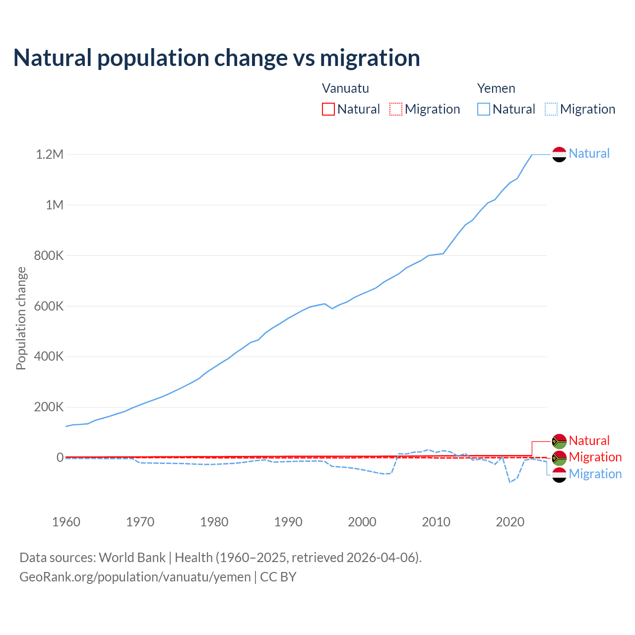Over the last 10 years, 92.2% of the population change in Vanuatu is from natural causes (a gain of 72,941 people) and 7.81% is from migration (a loss of 6,181 people). In Yemen 97.8% is from natural causes (a gain of 10,460,813 people) and 2.17% is from migration (a loss of 231,814 people).