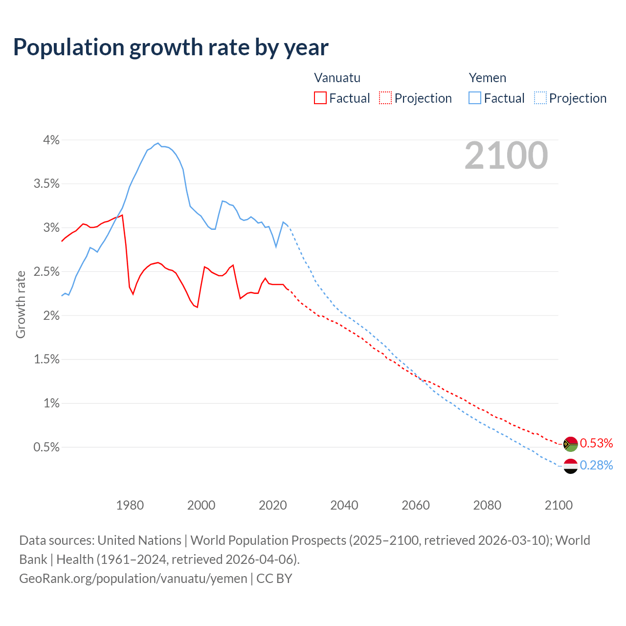 - For the last 10 years, Vanuatu has had an average growth rate of +2.33% per year vs +3% in Yemen.