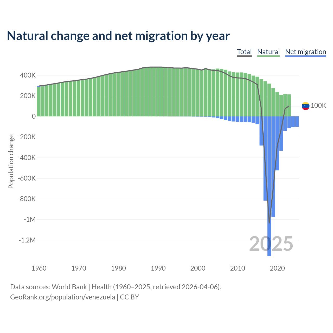 Over the last 10 years, 38.6% of the population change in Venezuela is from natural causes (a gain of 2,946,257 people) and 61.4% is from migration (a loss of 4,683,227 people).