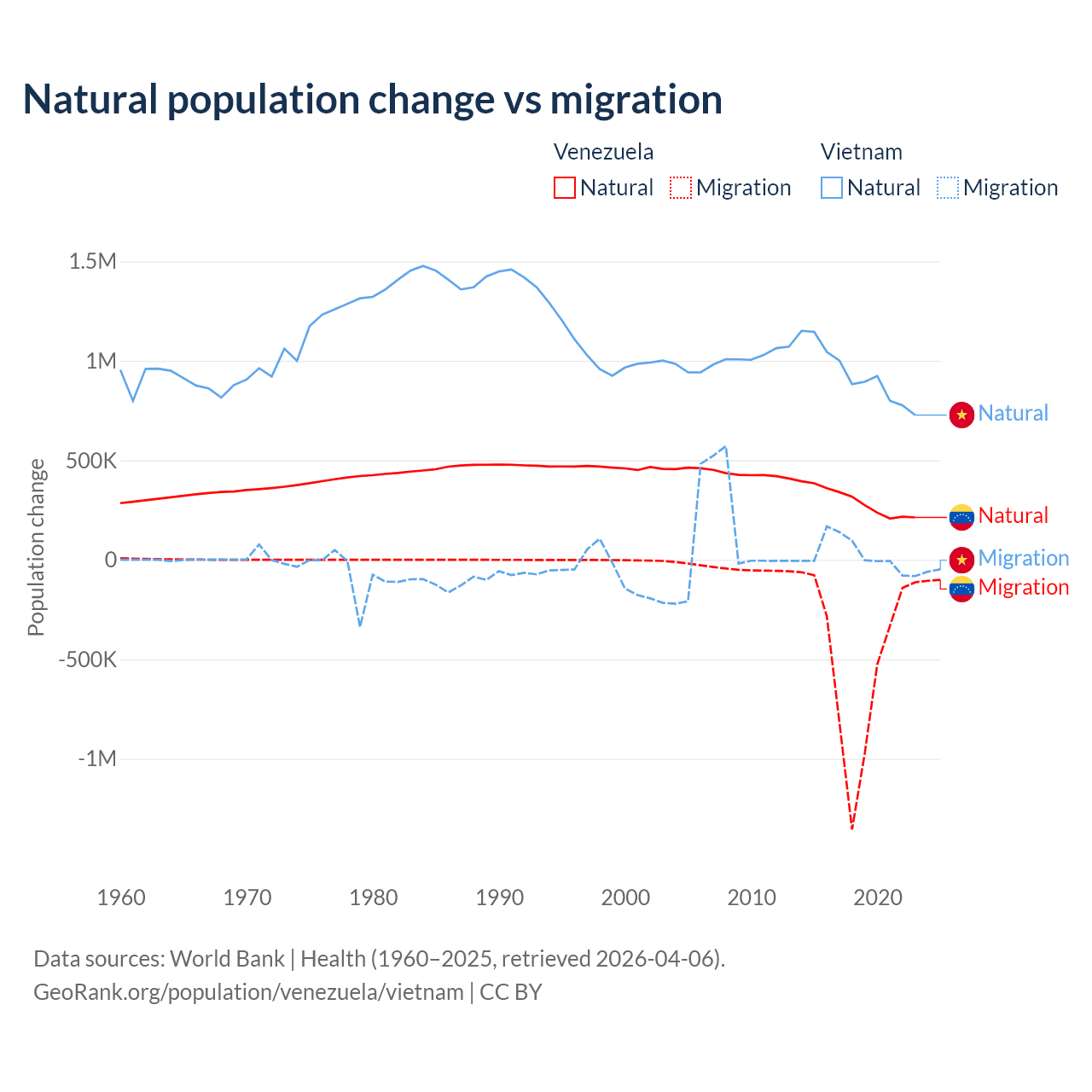 Over the last 10 years, 38.6% of the population change in Venezuela is from natural causes (a gain of 2,946,257 people) and 61.4% is from migration (a loss of 4,683,227 people). In Vietnam 97.7% is from natural causes (a gain of 9,349,756 people) and 2.29% is from migration (a gain of 219,073 people).