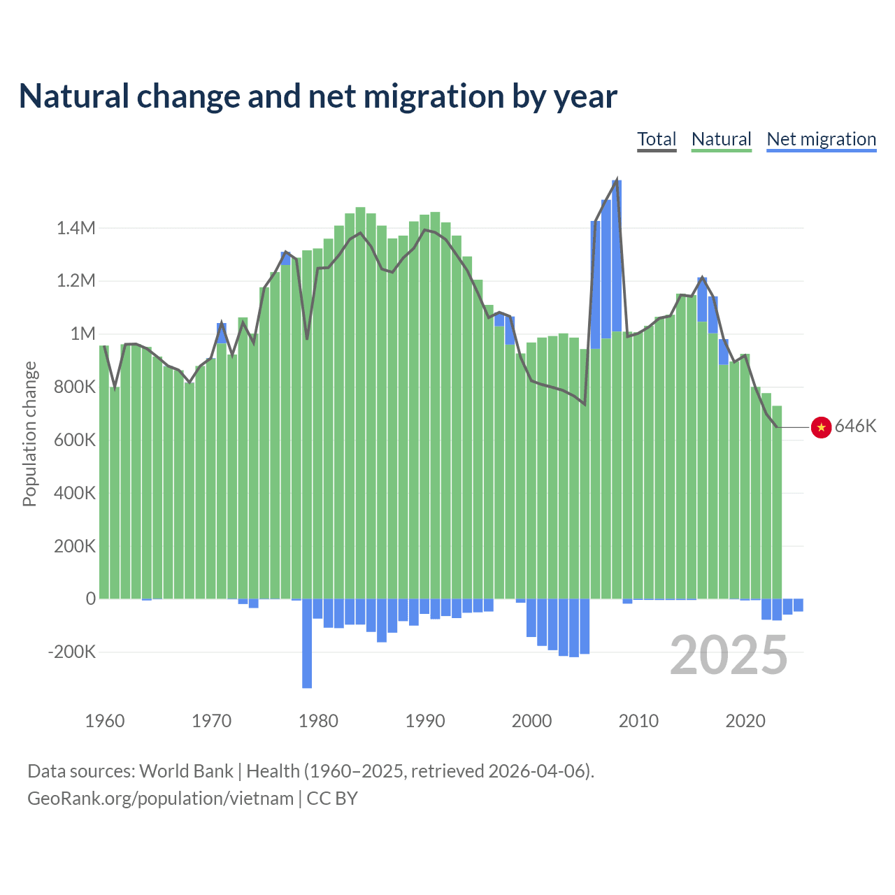Over the last 10 years, 97.7% of the population change in Vietnam is from natural causes (a gain of 9,349,756 people) and 2.29% is from migration (a gain of 219,073 people).