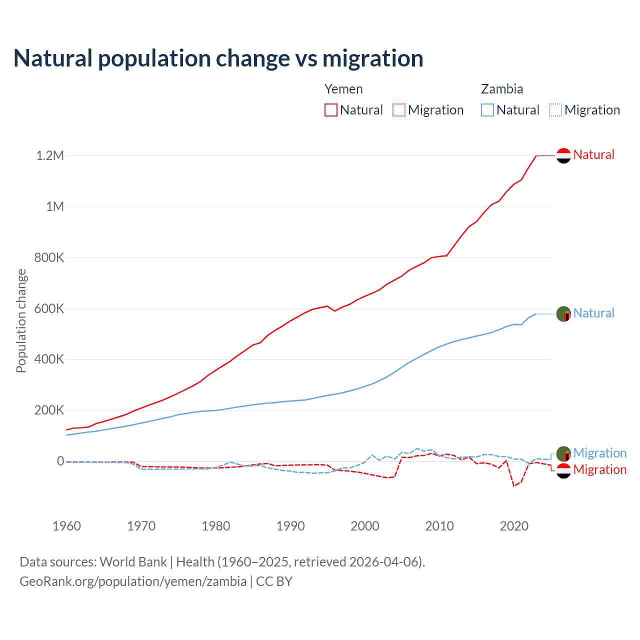 Over the last 10 years, 97.8% of the population change in Yemen is from natural causes (a gain of 10,460,813 people) and 2.17% is from migration (a loss of 231,814 people). In Zambia 97.4% is from natural causes (a gain of 5,233,797 people) and 2.58% is from migration (a gain of 138,554 people).
