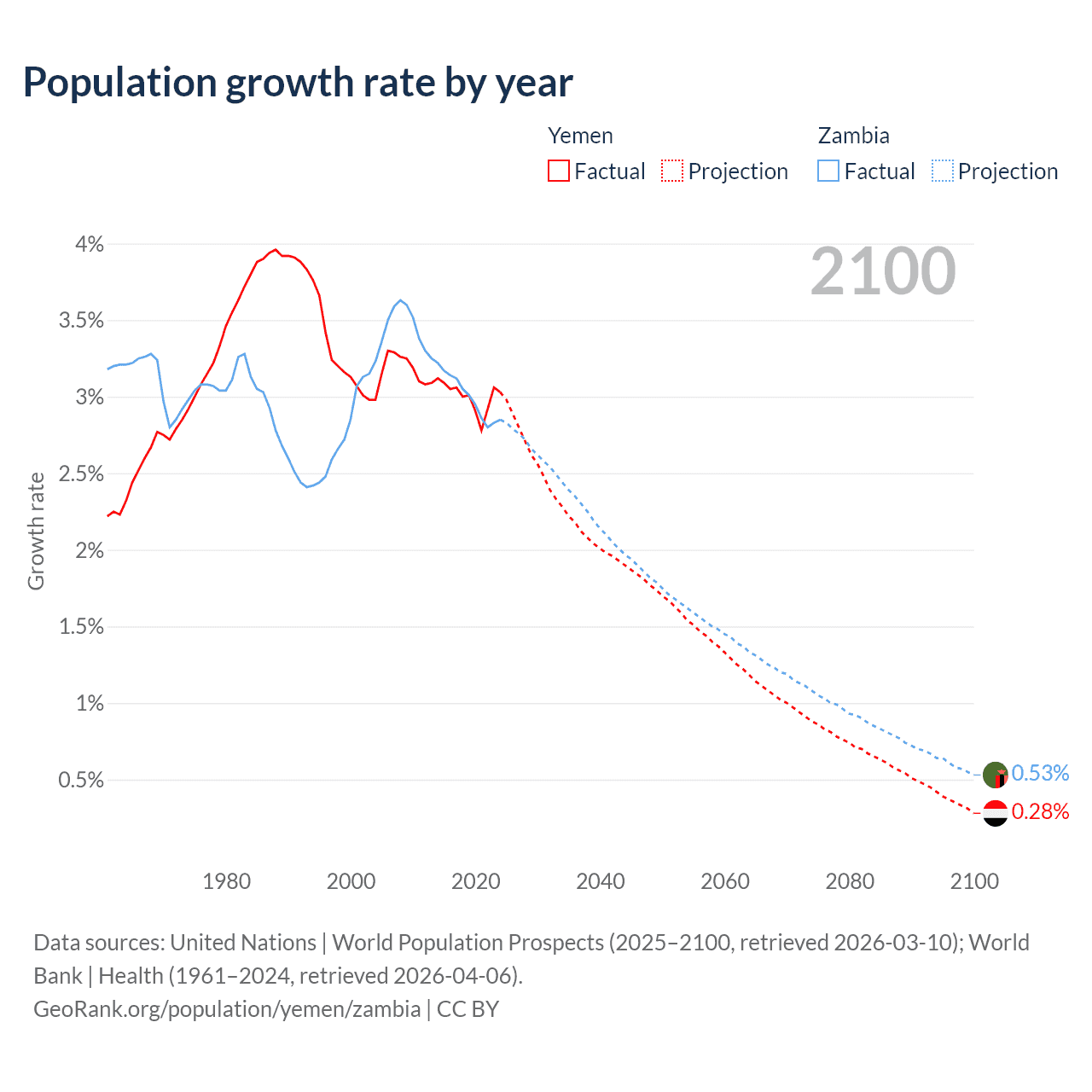 Yemen vs Zambia: population by year and forecast