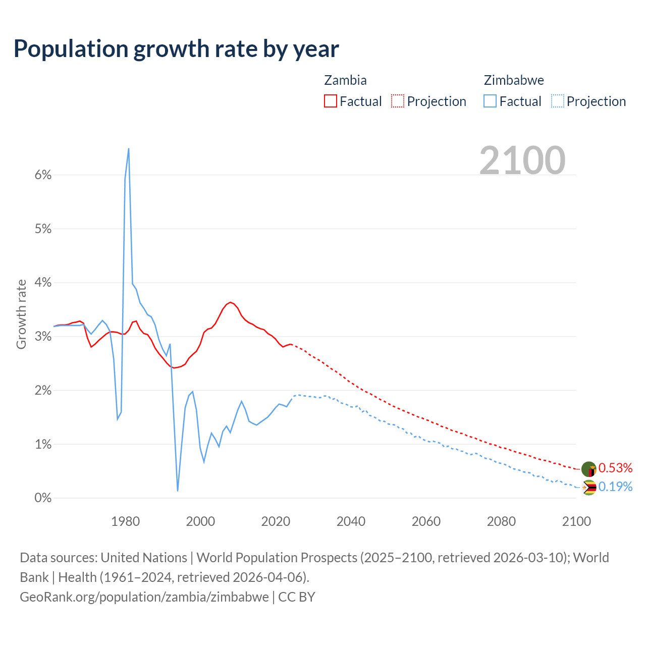 Data sources: World Bank | Health (1960–2024, retrieved 2026-04-06); United Nations | World Population Prospects (1960–2026, retrieved 2026-03-10); U.S. Census Bureau (1960–2025, retrieved 2026-02-08); Central Intelligence Agency (CIA) (2000–2019, retrieved 2026-02-20).
