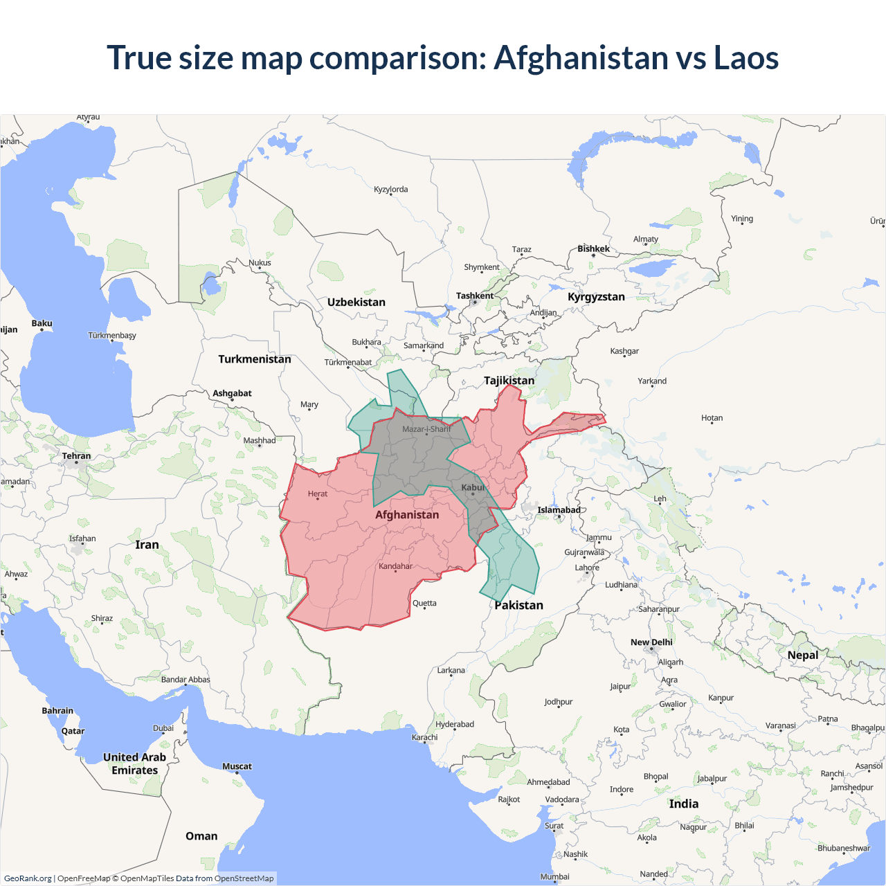 The map above outlines the borders of Afghanistan and Laos but is not accurate for size comparison because it's a 2d map with Mercator projection that distorts territories near the poles. The farther a country is from the equator, the more magnified it appears. More about country size projections.