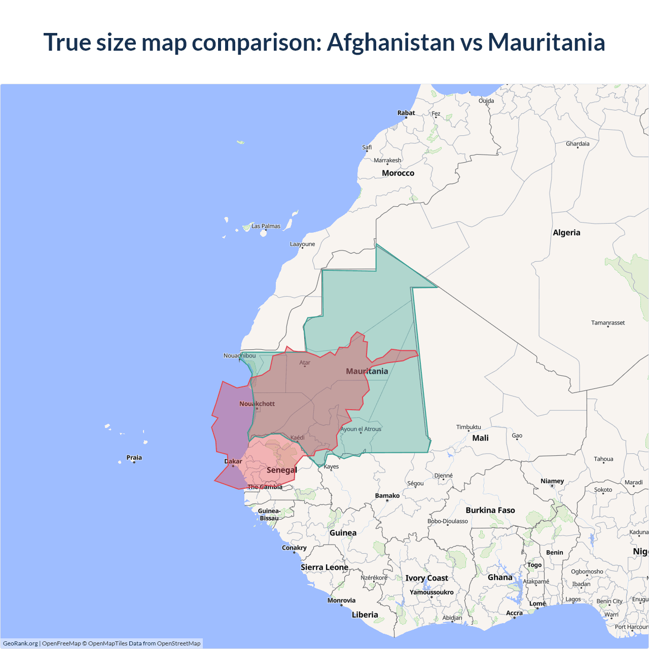 The map above outlines the borders of Afghanistan and Mauritania but is not accurate for size comparison because it's a 2d map with Mercator projection that distorts territories near the poles. The farther a country is from the equator, the more magnified it appears. More about country size projections.
