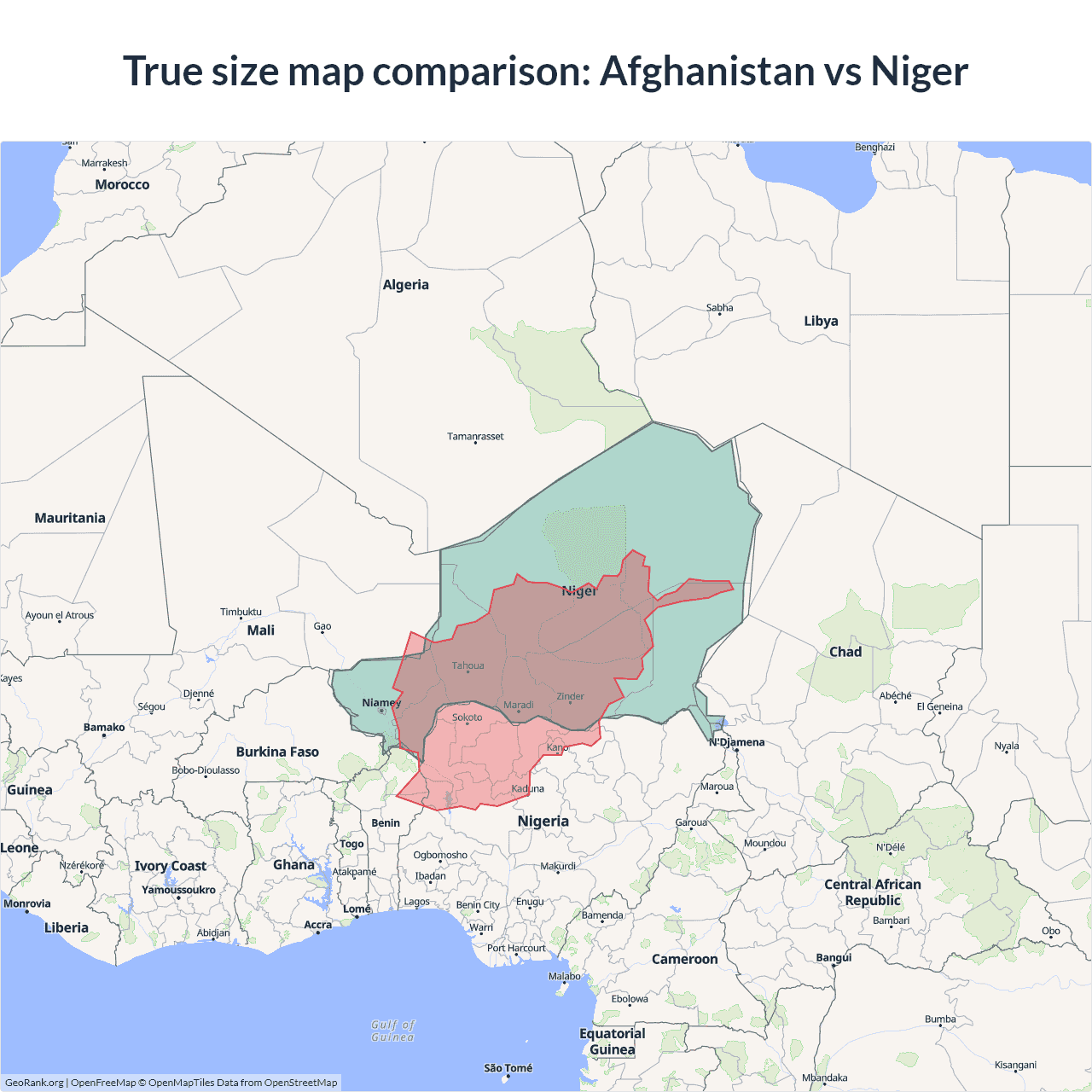 The map above outlines the borders of Afghanistan and Niger but is not accurate for size comparison because it's a 2d map with Mercator projection that distorts territories near the poles. The farther a country is from the equator, the more magnified it appears. More about country size projections.
