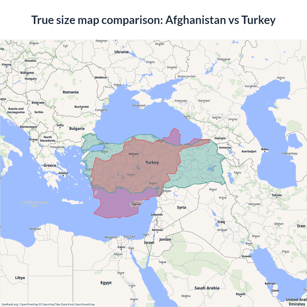The map above outlines the borders of Afghanistan and Turkey but is not accurate for size comparison because it's a 2d map with Mercator projection that distorts territories near the poles. The farther a country is from the equator, the more magnified it appears. More about country size projections.