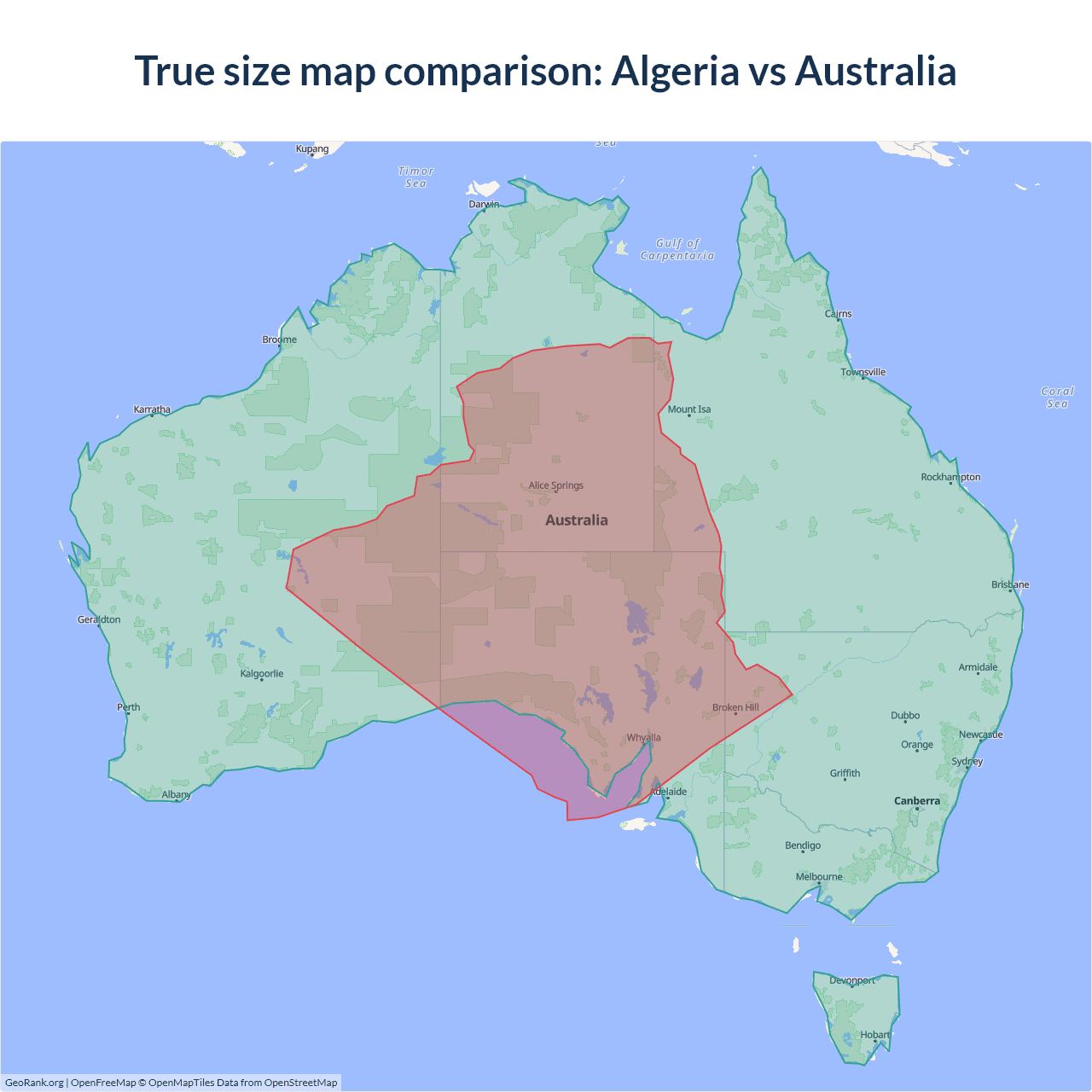 The map above outlines the borders of Algeria and Australia but is not accurate for size comparison because it's a 2d map with Mercator projection that distorts territories near the poles. The farther a country is from the equator, the more magnified it appears. More about country size projections.