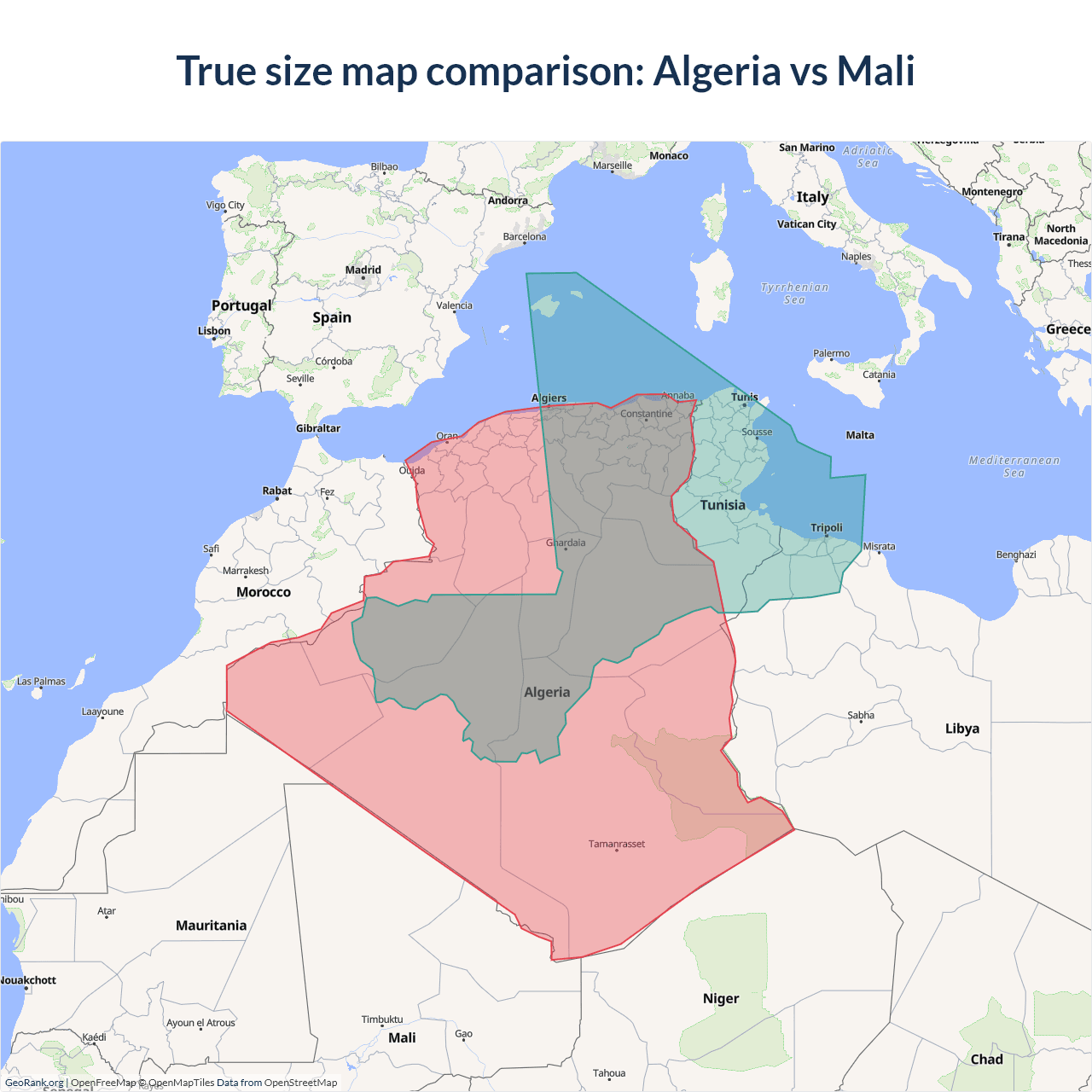 The map above outlines the borders of Algeria and Mali but is not accurate for size comparison because it's a 2d map with Mercator projection that distorts territories near the poles. The farther a country is from the equator, the more magnified it appears. More about country size projections.