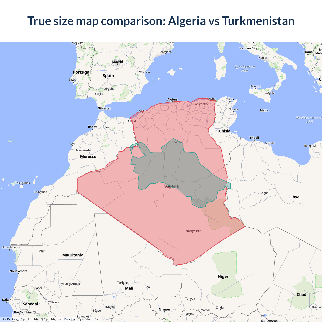 The map above outlines the borders of Algeria and Turkmenistan but is not accurate for size comparison because it's a 2d map with Mercator projection that distorts territories near the poles. The farther a country is from the equator, the more magnified it appears. More about country size projections.
