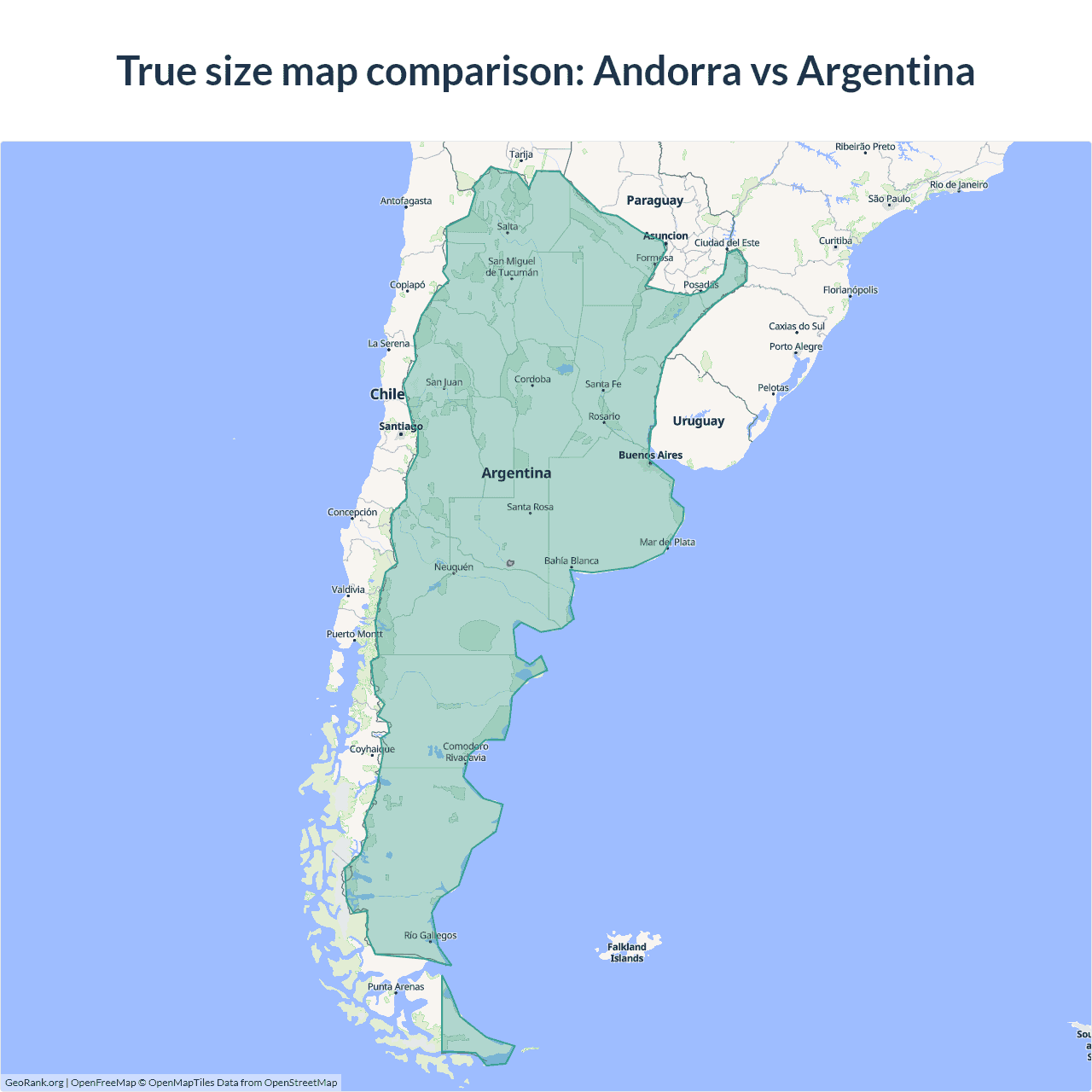 The map above outlines the borders of Andorra and Argentina but is not accurate for size comparison because it's a 2d map with Mercator projection that distorts territories near the poles. The farther a country is from the equator, the more magnified it appears. More about country size projections.