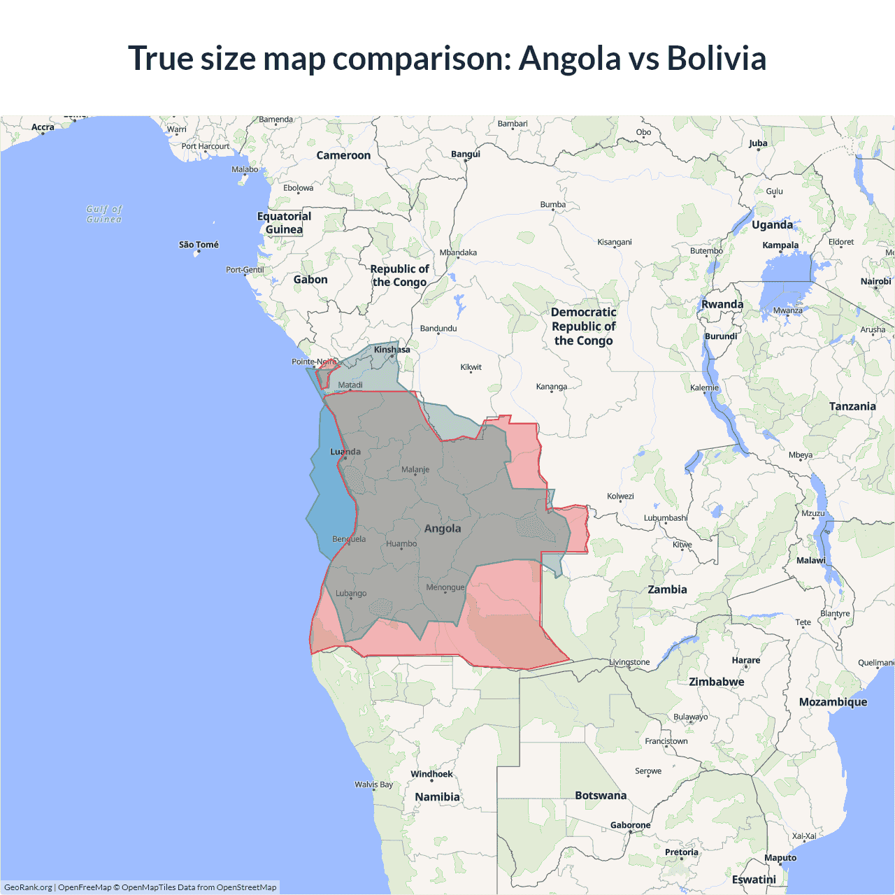 The map above outlines the borders of Angola and Bolivia but is not accurate for size comparison because it's a 2d map with Mercator projection that distorts territories near the poles. The farther a country is from the equator, the more magnified it appears. More about country size projections.