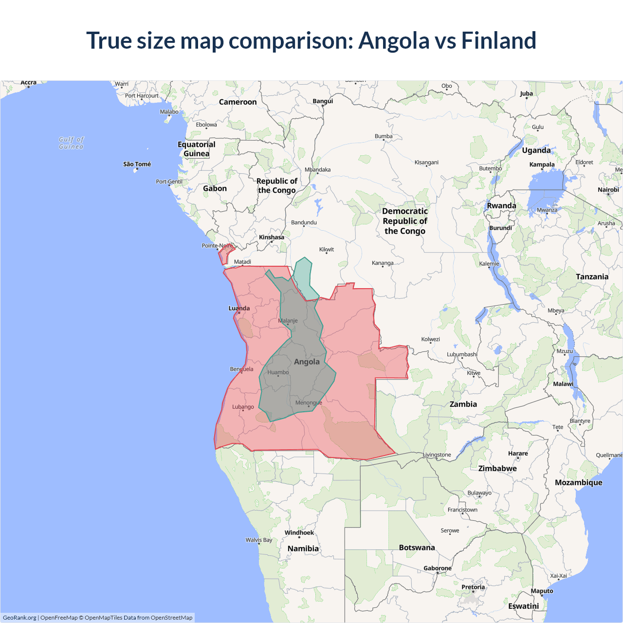 The map above outlines the borders of Angola and Finland but is not accurate for size comparison because it's a 2d map with Mercator projection that distorts territories near the poles. The farther a country is from the equator, the more magnified it appears. More about country size projections.