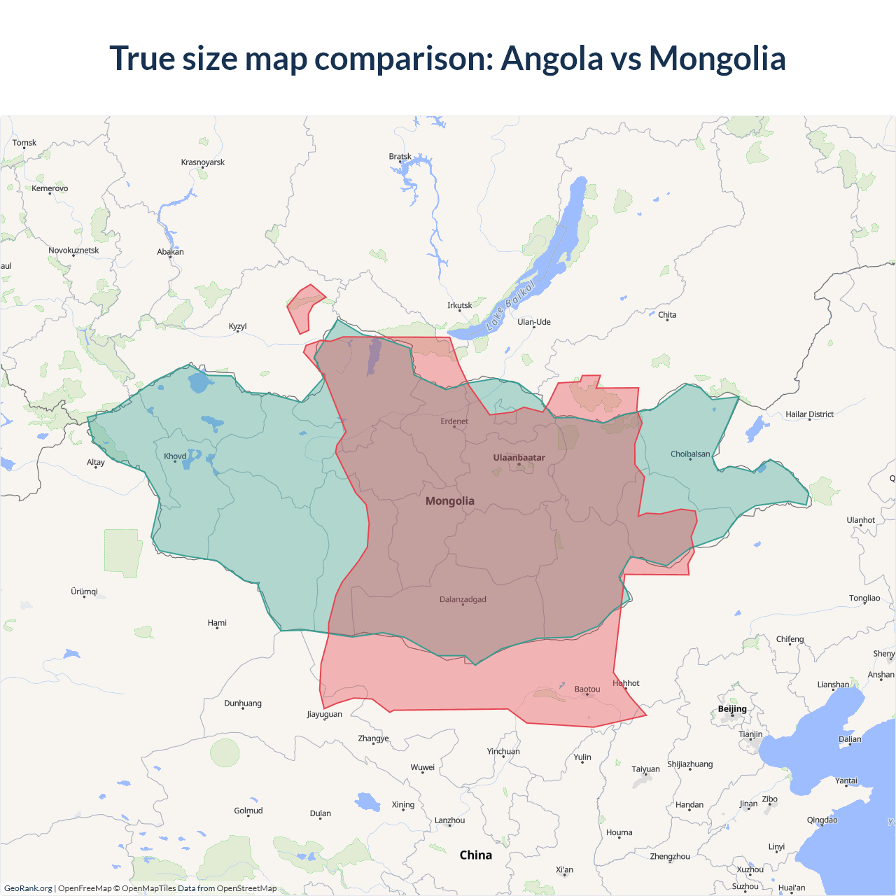 The map above outlines the borders of Angola and Mongolia but is not accurate for size comparison because it's a 2d map with Mercator projection that distorts territories near the poles. The farther a country is from the equator, the more magnified it appears. More about country size projections.
