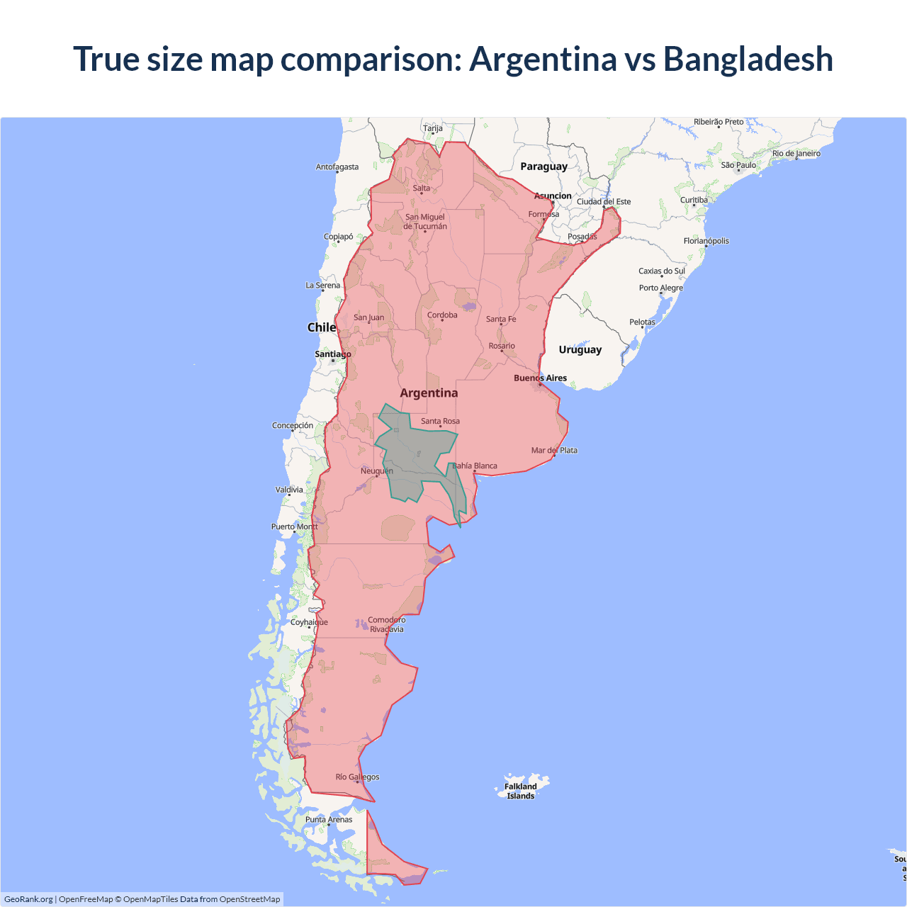 The map above outlines the borders of Argentina and Bangladesh but is not accurate for size comparison because it's a 2d map with Mercator projection that distorts territories near the poles. The farther a country is from the equator, the more magnified it appears. More about country size projections.