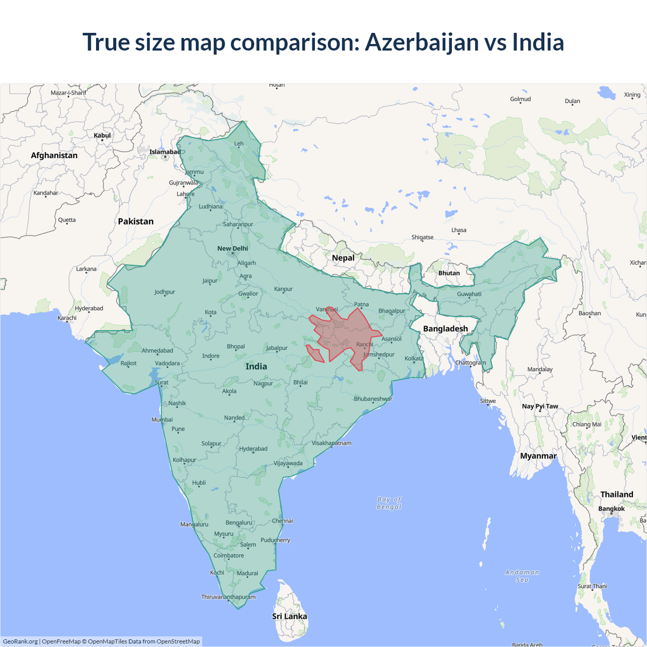 The map above outlines the borders of Azerbaijan and India but is not accurate for size comparison because it's a 2d map with Mercator projection that distorts territories near the poles. The farther a country is from the equator, the more magnified it appears. More about country size projections.