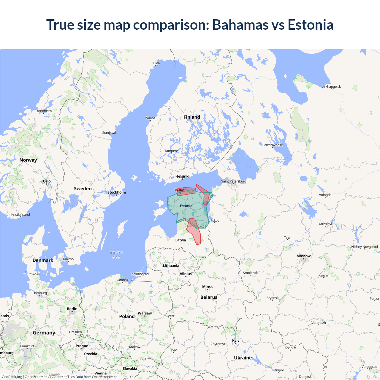 The map above outlines the borders of the Bahamas and Estonia but is not accurate for size comparison because it's a 2d map with Mercator projection that distorts territories near the poles. The farther a country is from the equator, the more magnified it appears. More about country size projections.