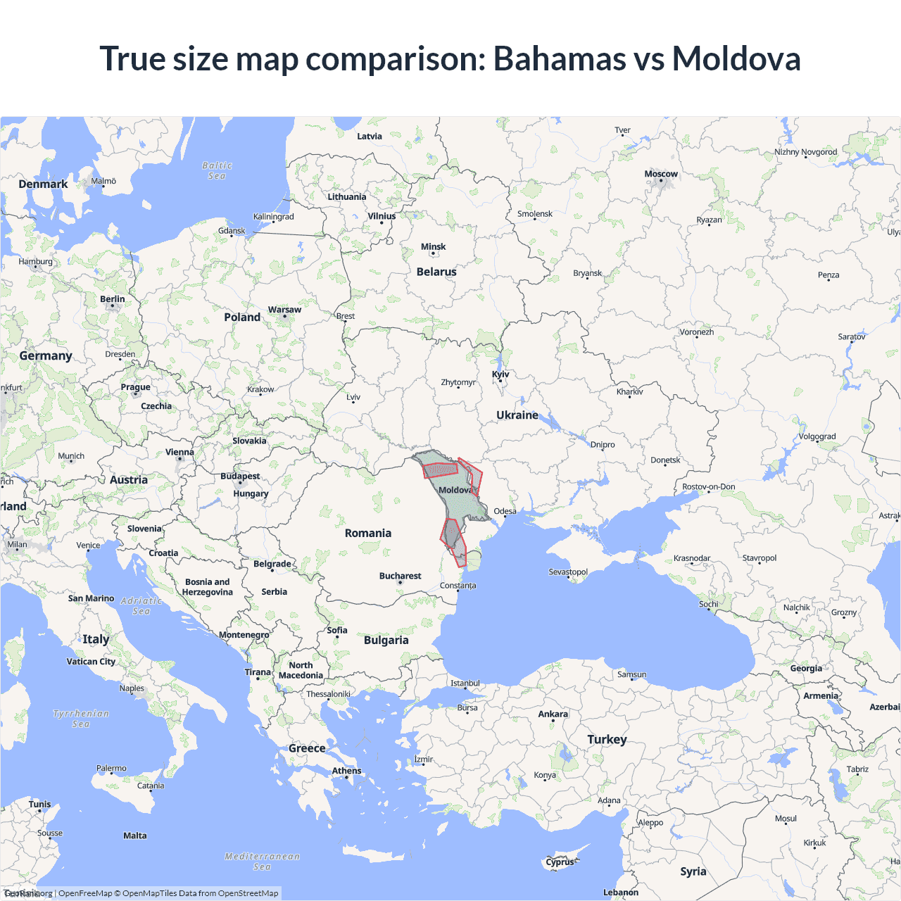 The map above outlines the borders of the Bahamas and Moldova but is not accurate for size comparison because it's a 2d map with Mercator projection that distorts territories near the poles. The farther a country is from the equator, the more magnified it appears. More about country size projections.